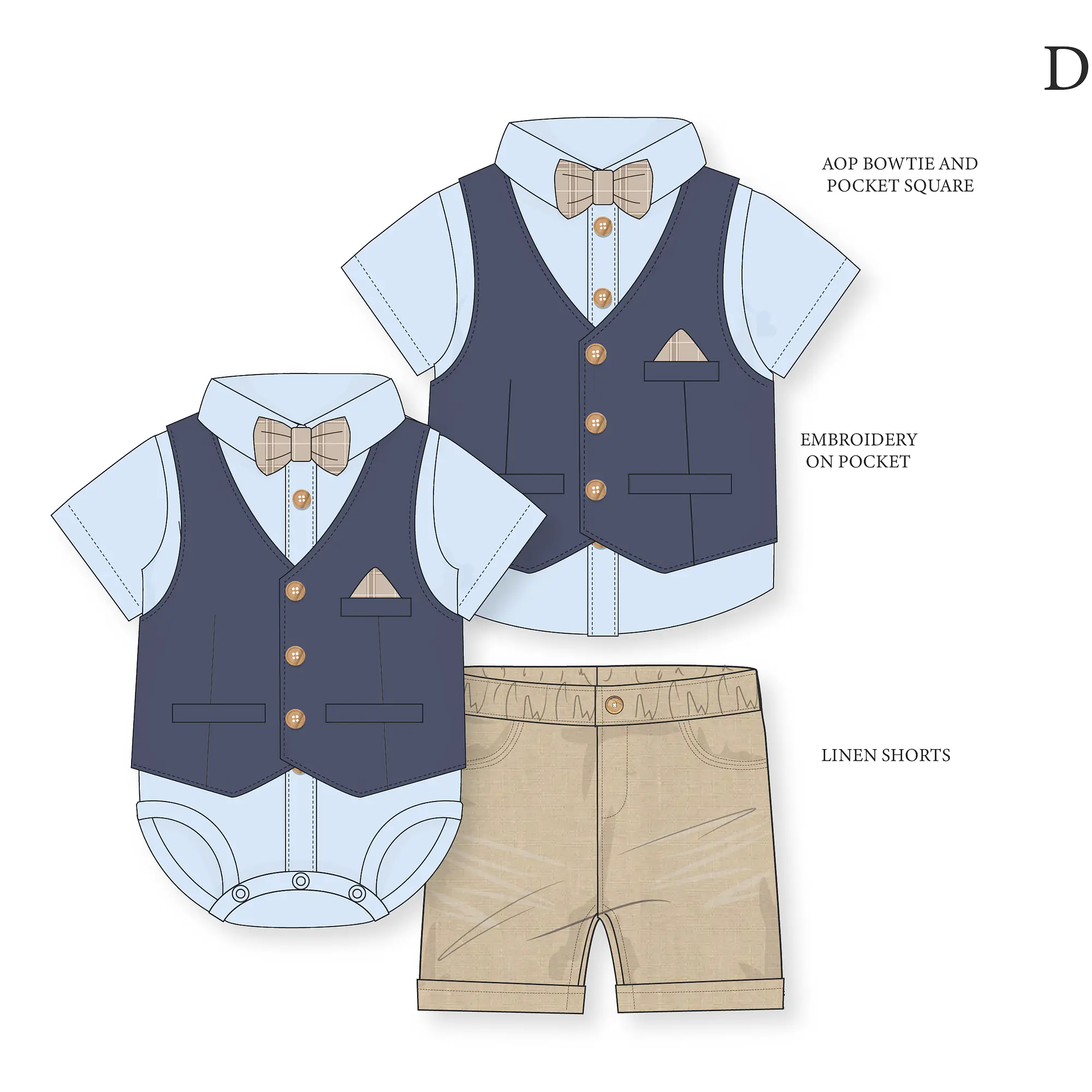 This set includes a navy waistcoat / long sleeved blue shirt / cream linen look trouser & bow tie to match the hankerchief look on the waistcoat