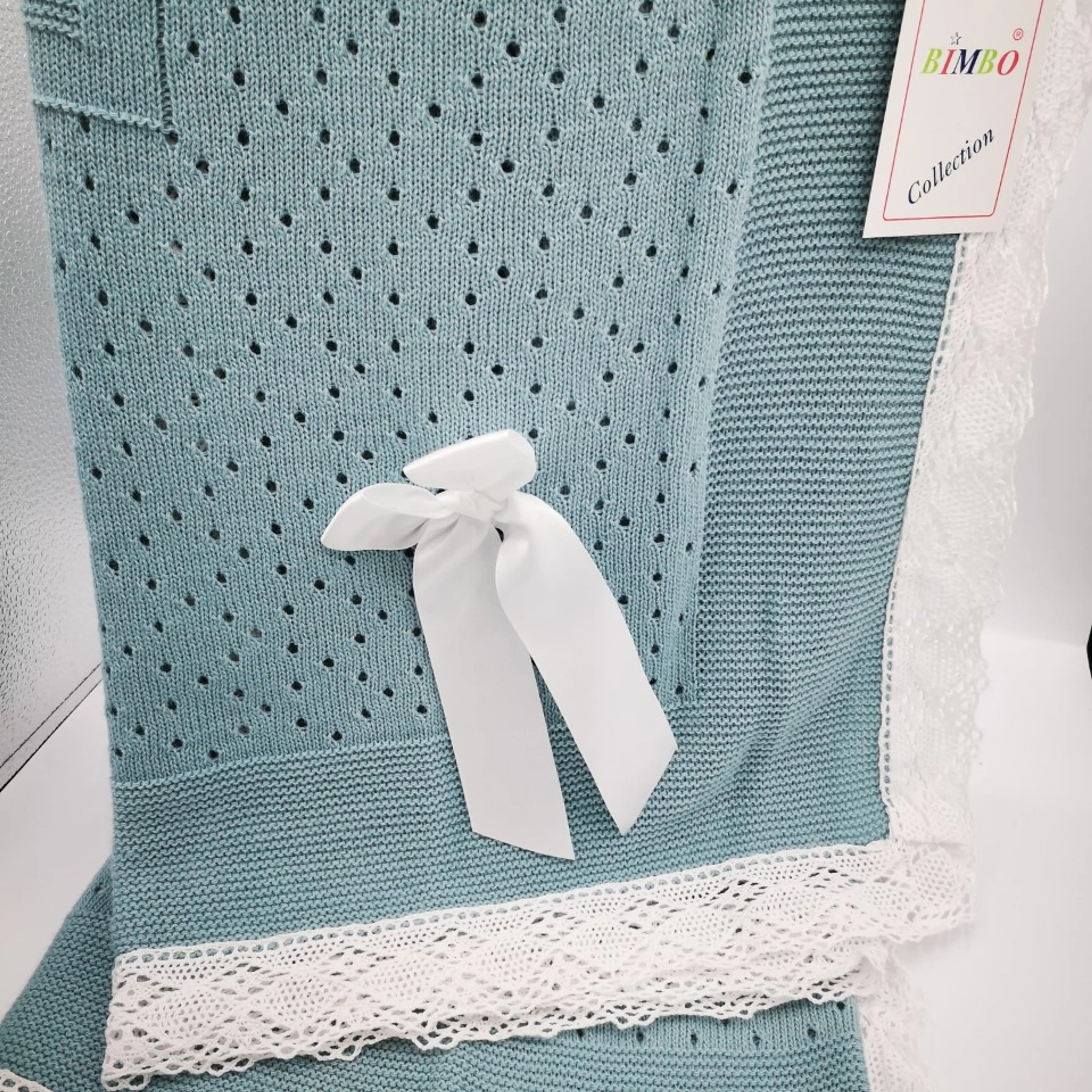 Teal Blue shawl with white crochet lace trim & white satin bow