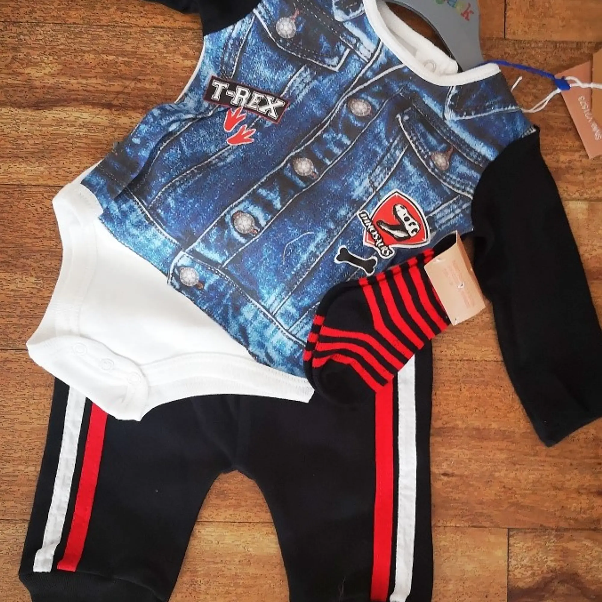 The shirt has long sleeves and a jean jacket print in shades of black & blue -the jog pants are black with red & white stripes - this is all complemented with socks - all displayed on a hanger