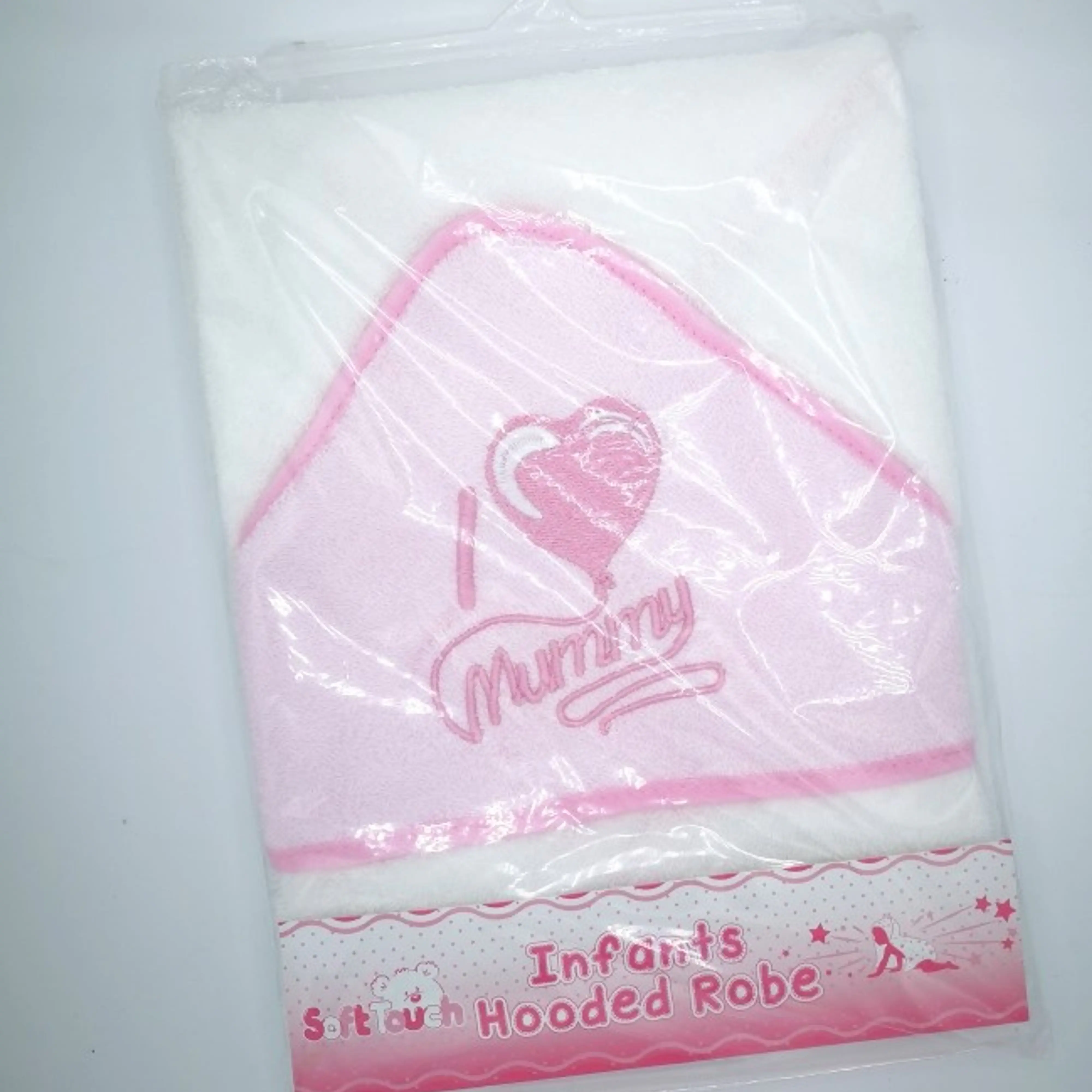 White Bath Robe /Baby Hooded Towel with pink hood area & embroidery detail