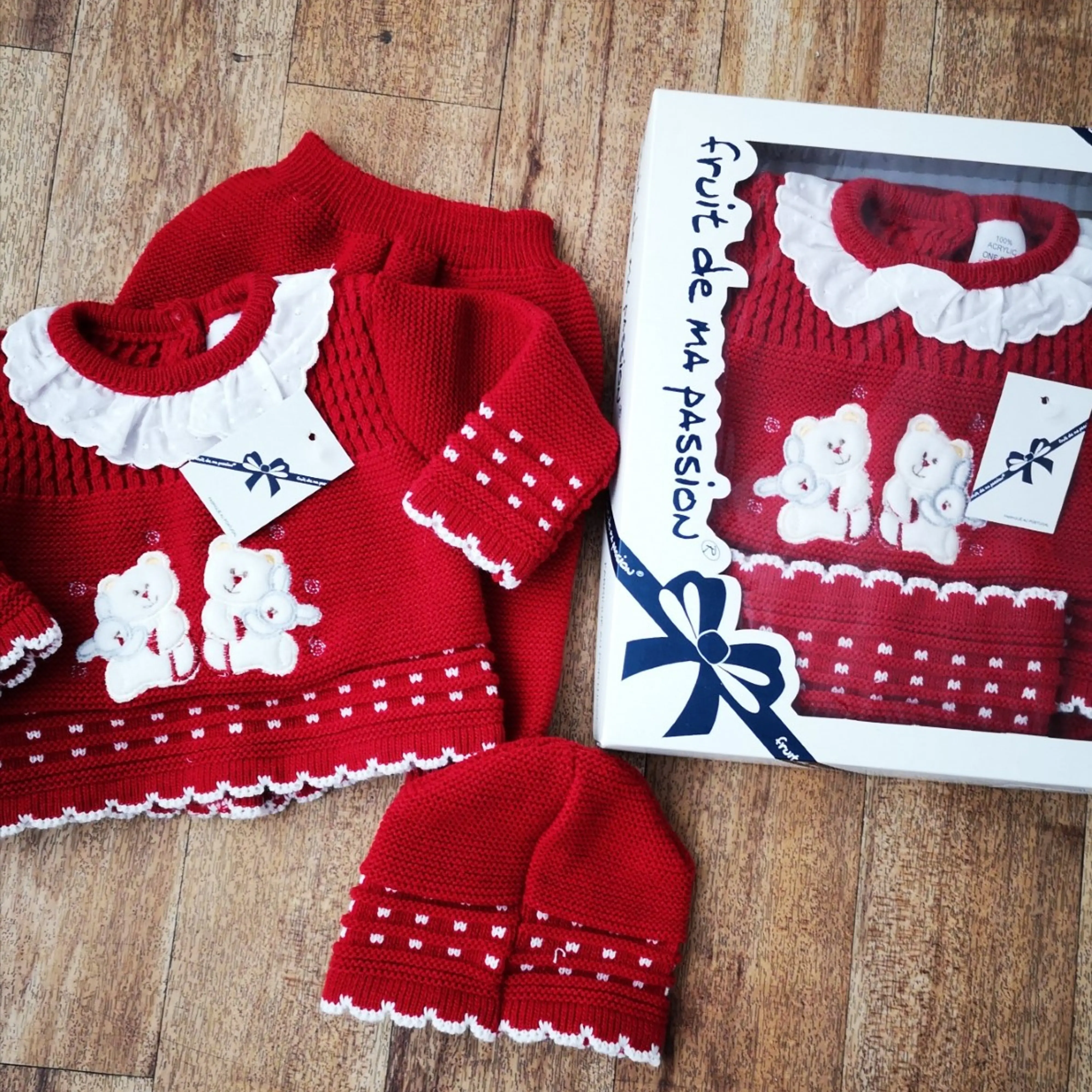 This style comes in a Gift Box and includes a knitted legging/ jumper & hat