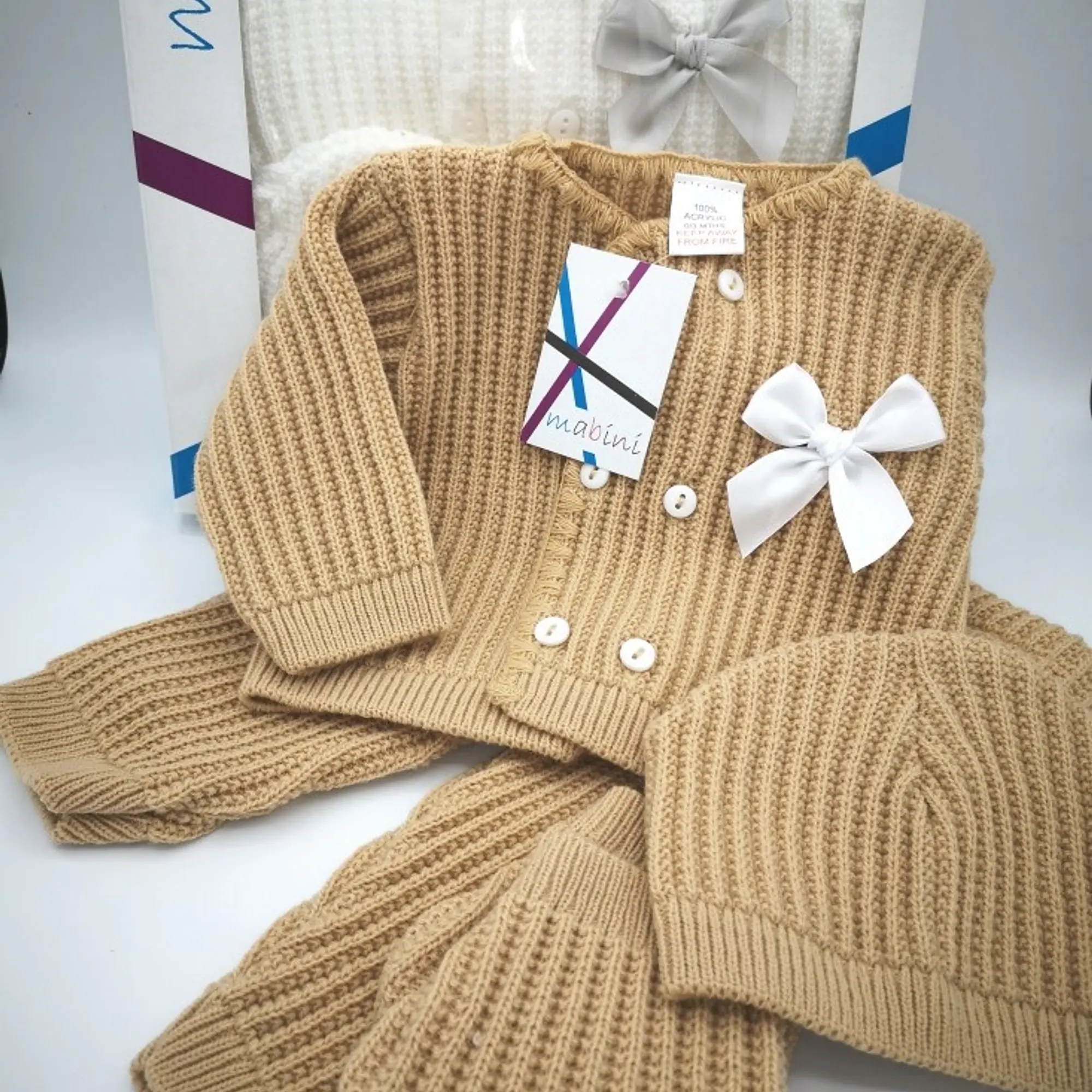 This combination comes in a gift box and includes a Knitted Legging Set / Bootees /Hat & Top with a satin ribbon