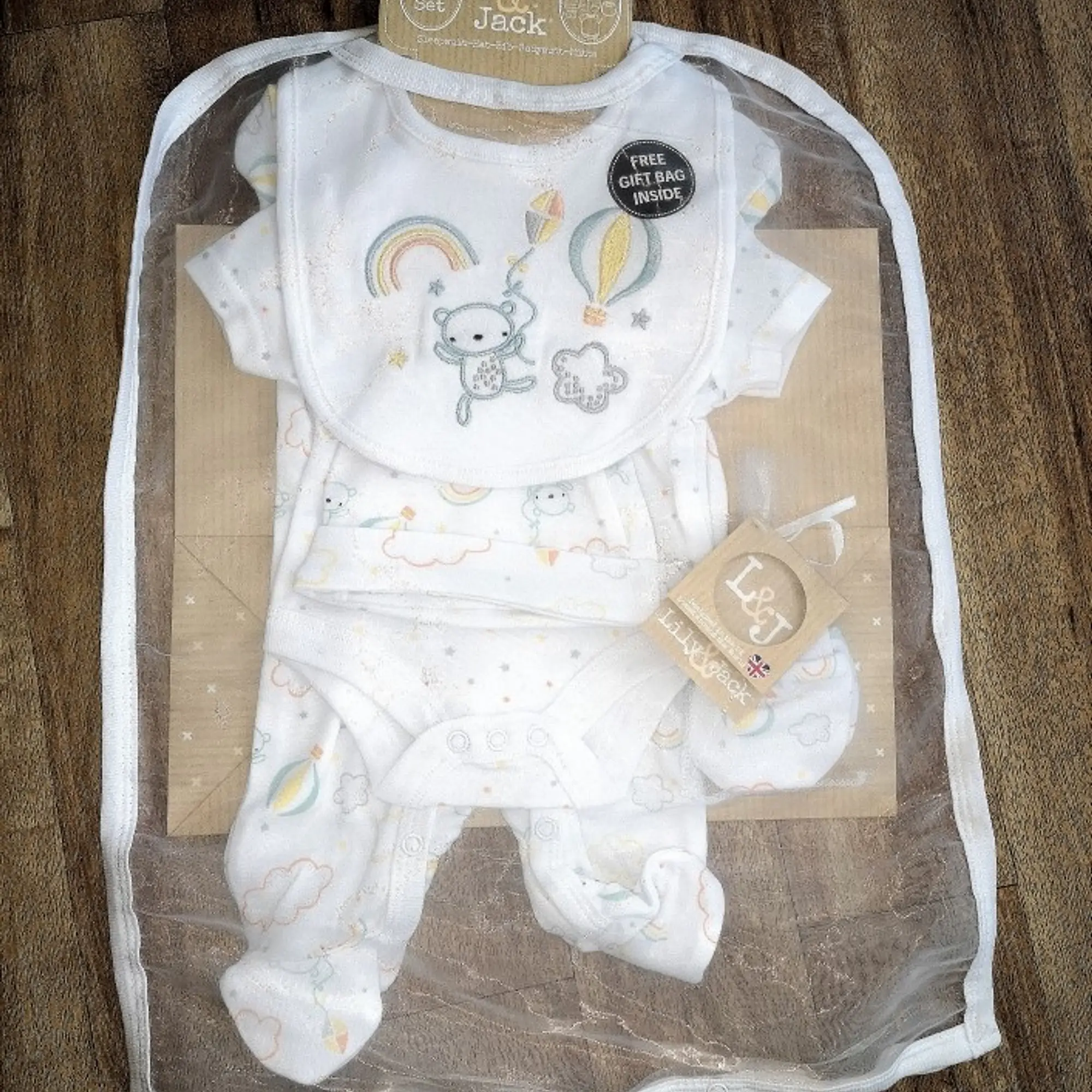 5pcs Gift Set - includes a babygrow/ bodyvest/ hat/ mitts / bib - all in the same white base with colours - all in a matching set together with a gift bag